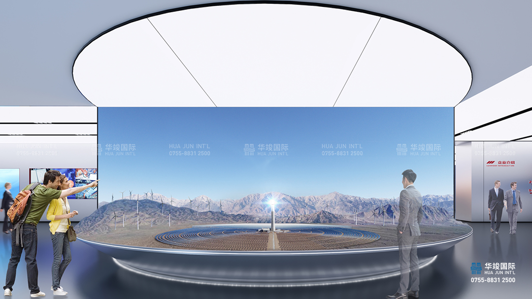 在蒼茫的戈壁灘上一朵盛開的“太陽花”,結合數字場景模型,打造沉浸式情景劇場,營造浩瀚廣袤、生機勃勃的空間氛圍,展示從聚光、集熱、儲熱到發電的全流程塔式光熱發電核心技術,實現了核心裝備的產業化、國產化。
